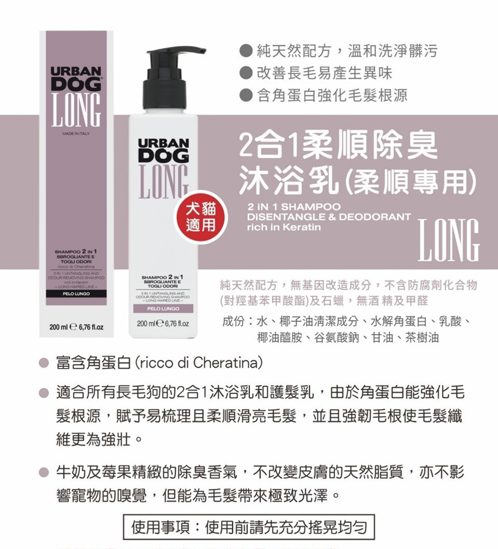 【義大利 Urban Dog】總代理-URBAN城市 2合1除臭沐浴乳(長毛系) 200ml/1L/5L 犬貓適用