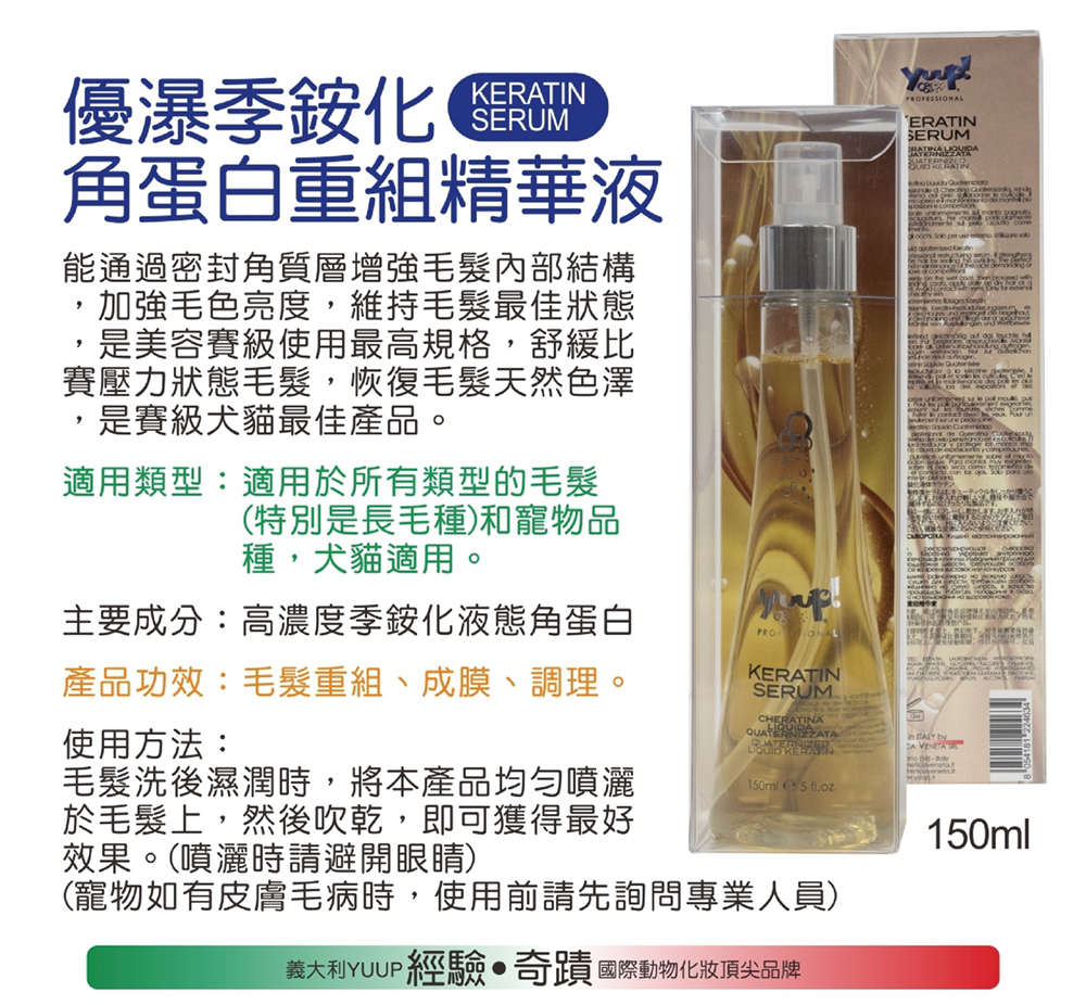 【義大利 Yuup】總代理-優瀑 季銨化角蛋白重組精華液 150ml 犬貓適用