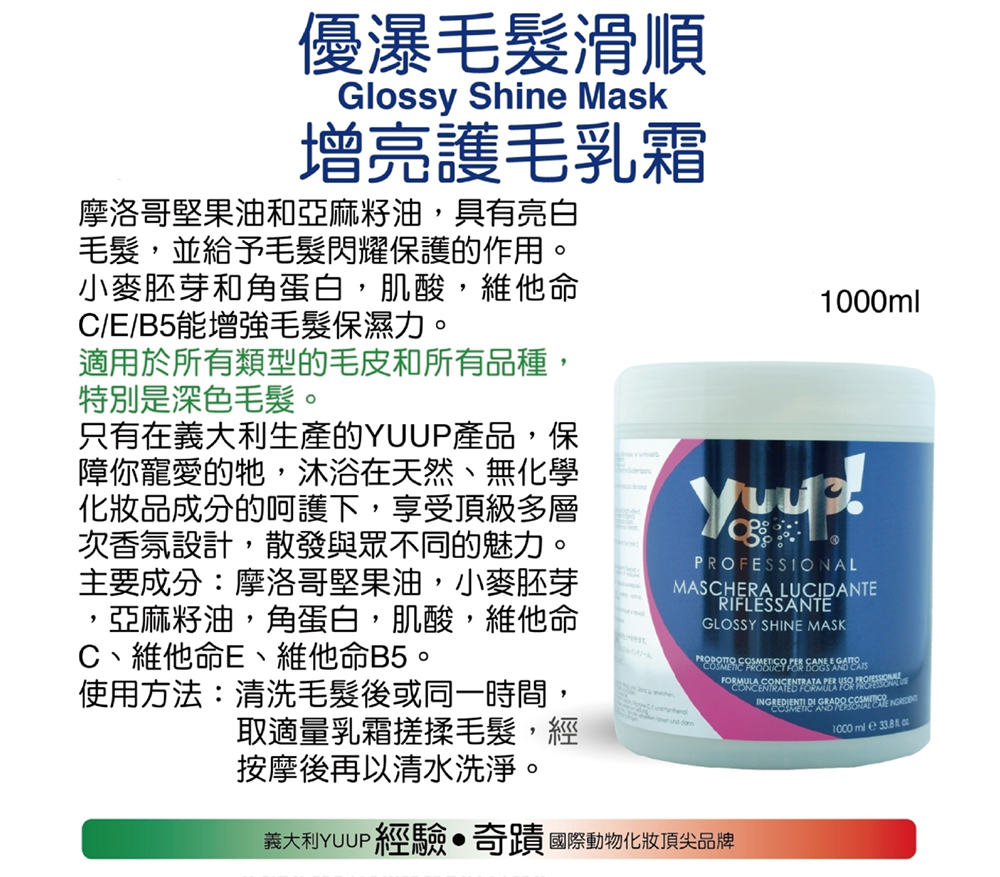 【義大利 Yuup】總代理-優瀑 毛髮滑順增亮護毛素 乳霜 1L 犬貓適用