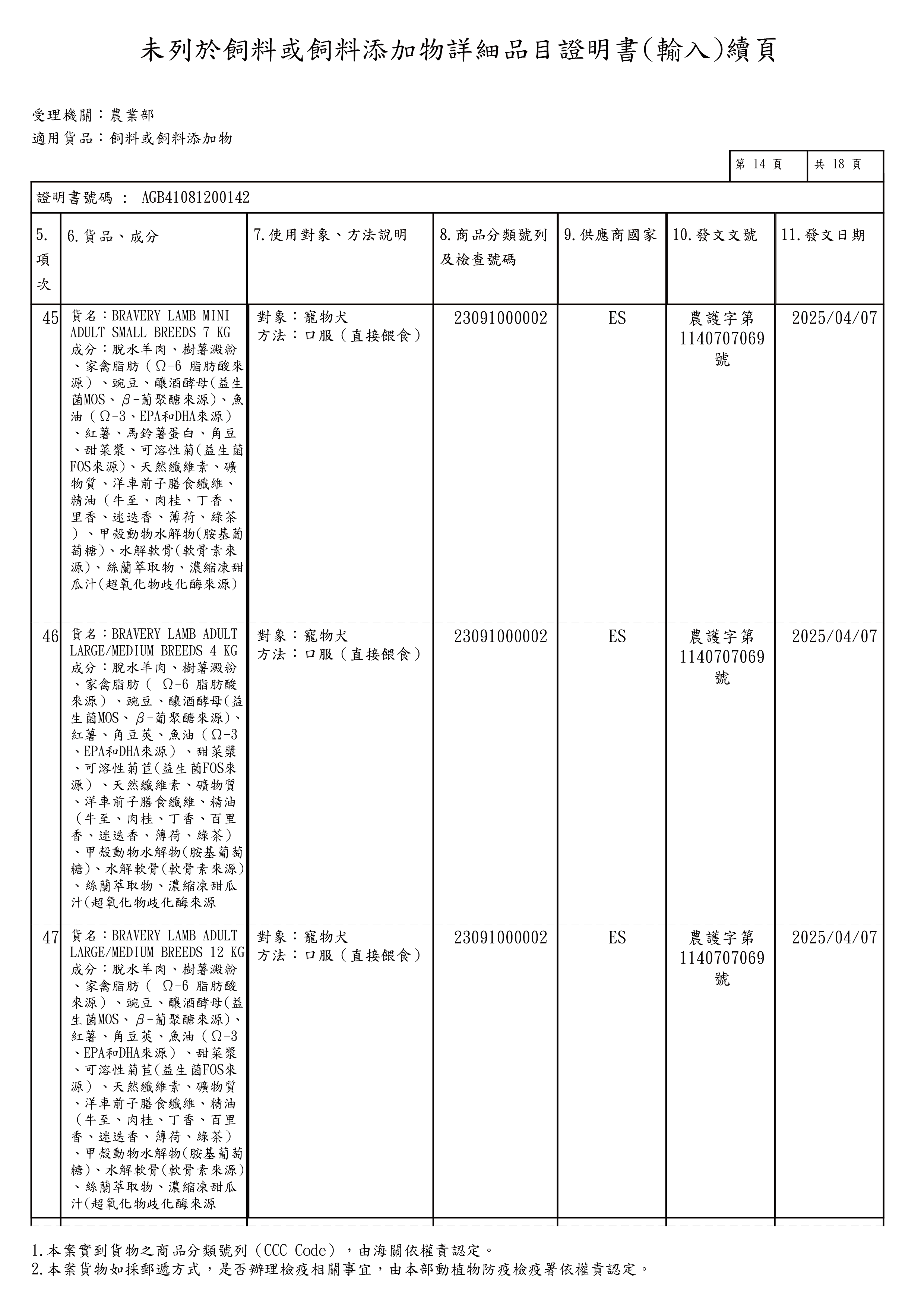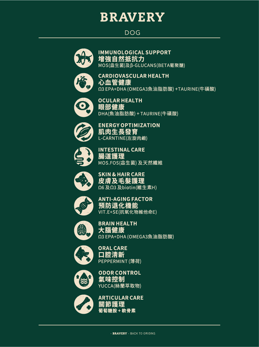 脫水羊肉、樹薯澱粉、家禽脂肪(Ω-6 脂肪酸來源)、豌豆、釀酒酵母(益生菌MOS、β-葡聚醣來源)、魚油(Ω-3、EPA和DHA來源)、紅薯、